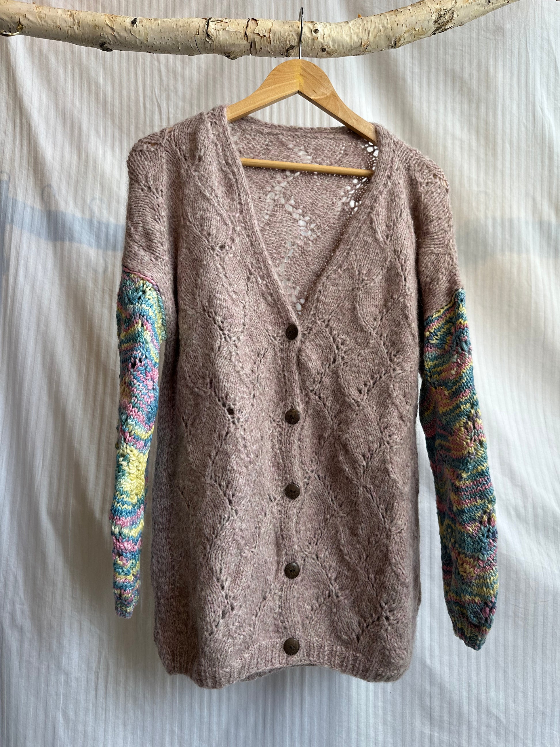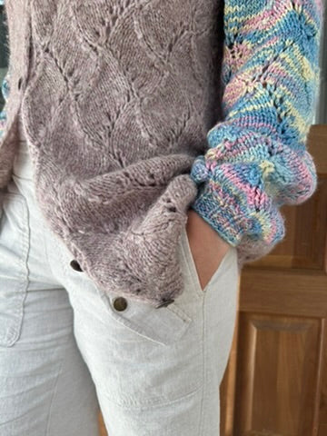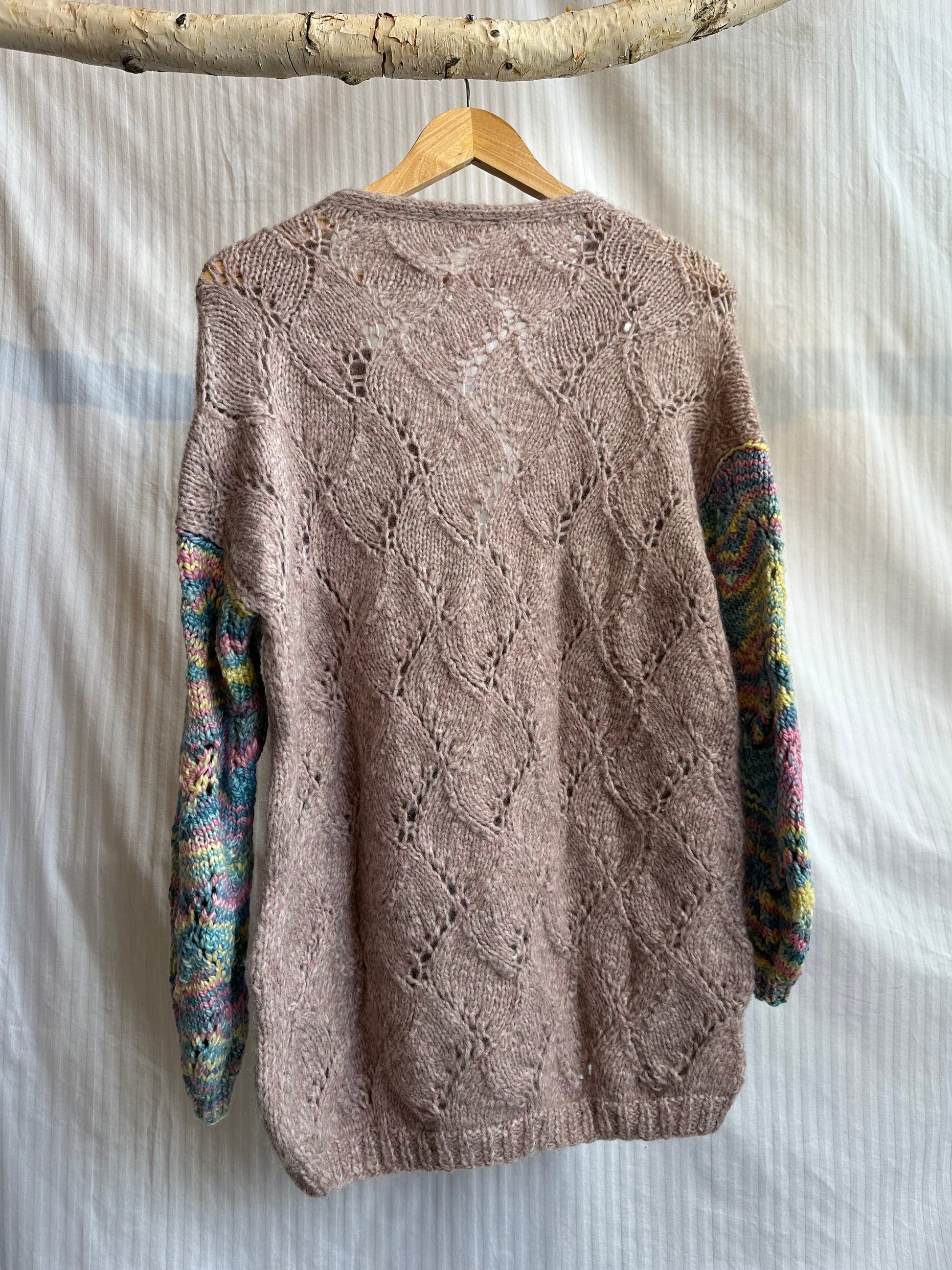 This exclusive sweater boasts a charming rose hue, made with plush baby alpaca fiber renowned for its cozy feel and hypoallergenic benefits. The detailed knitting incorporates classic cable stitches, creating a lovely blend of texture and eye-catching appeal. Bold, contrasting sleeves feature a playful blend of cheerful multicolored yarn, lending an imaginative and artistic touch to the overall aesthetic. Finally, the sweater is adorned with a set of earthy brown buttons that perfectly complement the soft color of the garment. Combining comfort and distinctive design, this piece is a tribute to the masterful artistry behind its making.