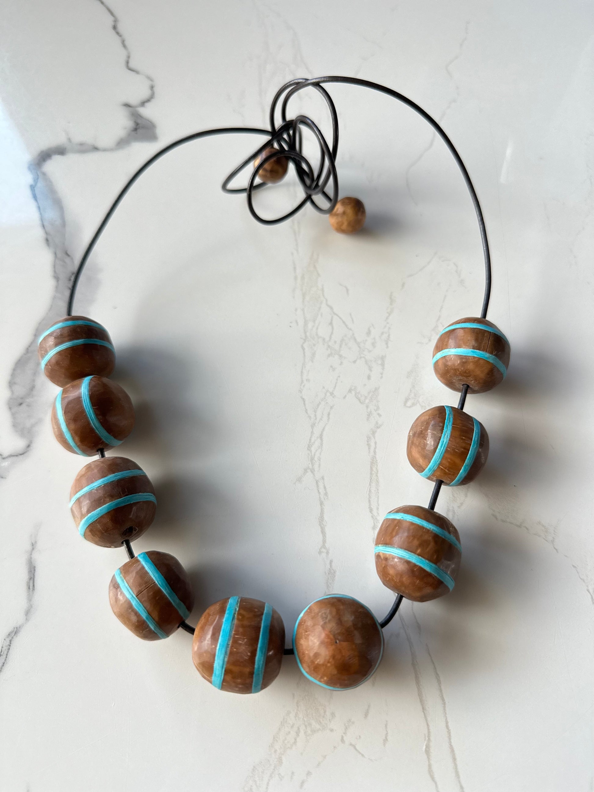 Catch the dreamy vibes with the Piá Azul Turquesa Necklace! This stunning necklace is made with beautiful turquoise-colored beads, handcrafted from piaçava coconut and paper. The supple leather string adds a hint of natural charm. An ideal accessory to add a pop of color to any outfit.